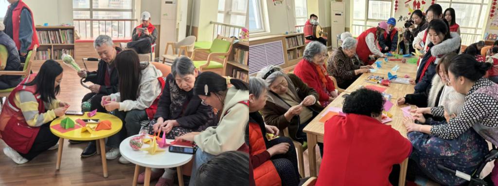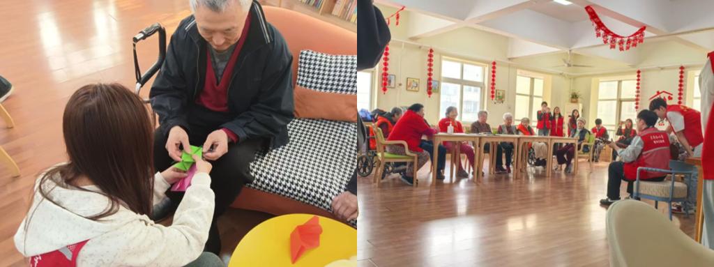 活动伊始,志愿者们分头到各楼层邀请老人们参加活动,同时耐心搀扶活动不便的老人。活动现场,志愿者们表演了欢乐的“被套舞”,五颜六色的被套在身上舞动,逗得老人们开怀大笑。接着,志愿者们拿起吉他,为老人们弹唱起熟悉的歌曲,老人们轻声跟唱,脸上洋溢着幸福的笑容。随后,志愿者们与老人一起进行折纸活动,小船、千纸鹤……在志愿者们的耐心帮助下,老人们也纷纷动手尝试。