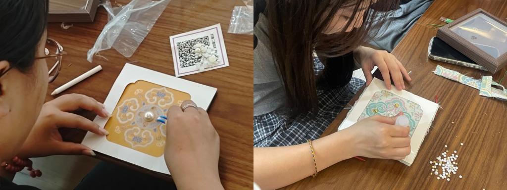 踏入宋锦珍珠画沙龙,精心准备的材料静候大家开启创意之旅。铺开宋锦面料,似与古老工艺对话,勾勒图案、粘贴珍珠,每一步都倾注专注。用亮片丝线装饰,装裱佳作,传统与创意于此交融,是对非遗文化的现代演绎。