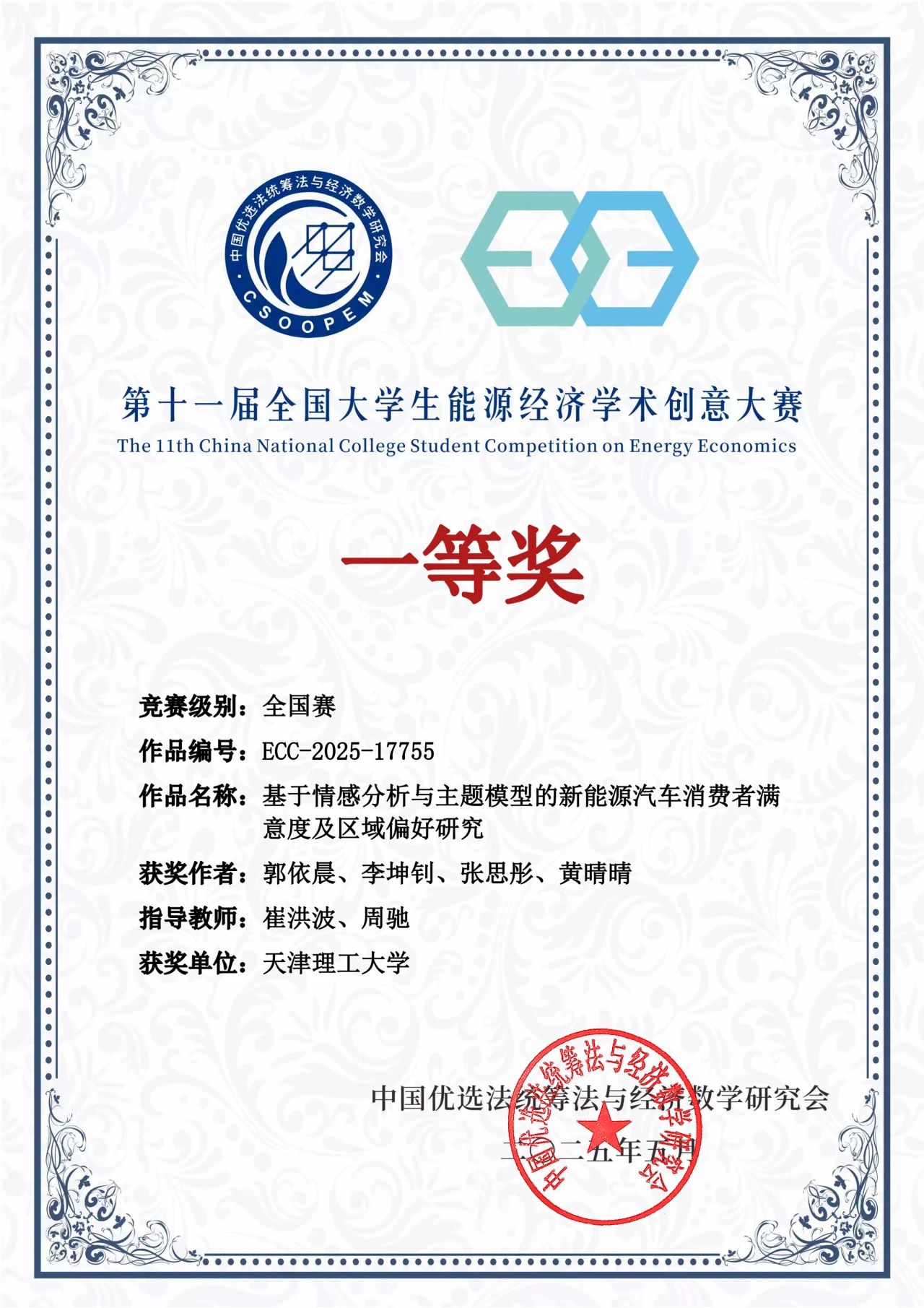 第十一届全国老员工能源经济学术创意大赛总决赛于5月24日至25日在山西财经大学举办。经过激烈角逐,公司本科生郭依晨、李坤钊、张思彤、黄晴晴共同完成的作品《基于情感分析与主题模型的新能源汽车消费者满意度及区域偏好研究》荣获本科生组全国一等奖,这是公司首次荣获该奖项。公司崔洪波老师和周驰老师获评优秀指导教师奖。