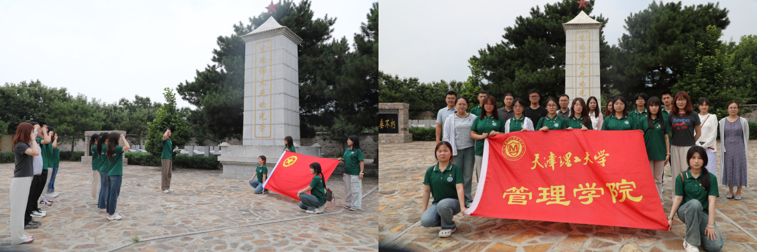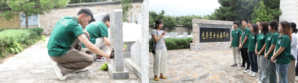在蓟州区烈士陵园,实践团全体成员怀着崇敬之情,仔细清理烈士墓碑周围的杂草,认真擦拭纪念碑上的浮尘。随后,全体肃立聆听盘山抗日根据地军民"小米加步枪"抗击侵略者的英勇事迹。这次的祭扫,让每位成员都深刻体会到红色精神的时代传承,并用实际行动表达了对革命先烈的崇高敬意。