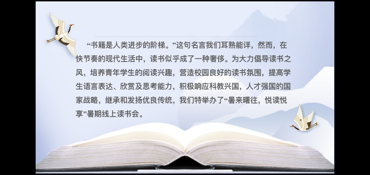 为营造浓厚的校园阅读氛围,提升同学们的思辨与表达能力,3044am永利于近期举办了“暑来曙往,悦读悦享”暑期线上读书会活动。