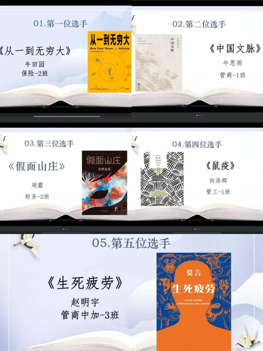 在活动前期,同学们通过精心准备,选择自己喜爱的书籍,并深入研读其中的经典片段,结合个人感悟撰写心得分享内容。活动当天,同学们通过腾讯会议相聚云端,依次分享了自己的阅读成果(具体内容)。他们通过生动的讲述和精彩的片段朗读,将书中的精华传达给每一位听众,现场气氛热烈,互动频繁。